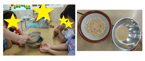 しっかりとすりつぶしたところで、ふるいにかけてみると、皮が取り除かれて、さらさらのきな粉になりました!