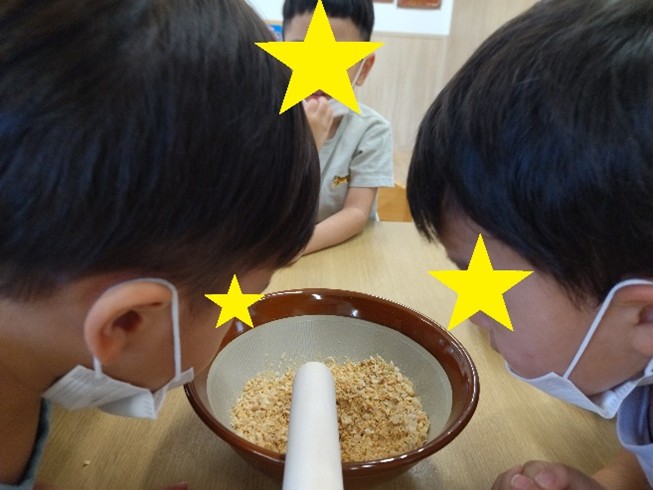 それと、何にも味付けされていない茹でられただけのマカロニがやってきました…きな粉がかかっていない、いつもと違うマカロニの姿に「え、なにこれ…」とちょぴり啞然としていましたよ(笑)このままだったら甘くないおやつになってしまうとのことで、美味しいマカロニきな粉を食べるためにみんなでレッツクッキング!!