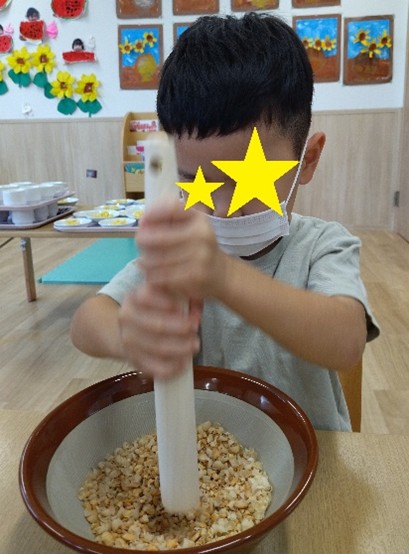 小さくなったお豆をすりこ木をもって、すり鉢のなかでどんどんと小さくしていきます。とんとんと叩いたり、力を込めてすりつぶしていきます。