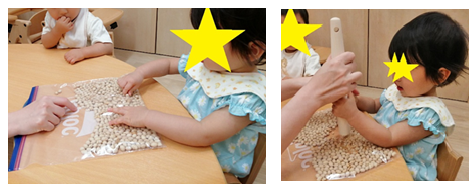 節分お豆をまずはゆめ組さんに叩いてもらいます。袋にいれて手で触ってみたり、すりこ木で叩いてつぶしてもらいましたよ。