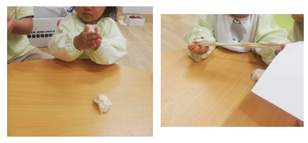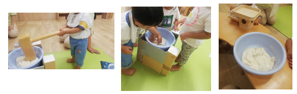 みんなでお月見団子を作ろう!!ということで、お餅に見立てた小麦粉粘土を準備し、餅つきをしました。よいしょー!!という元気な掛け声のもと、おいしそうな柔らかいお餅が完成!!触ってみると本当に柔らかくておいしそう!!