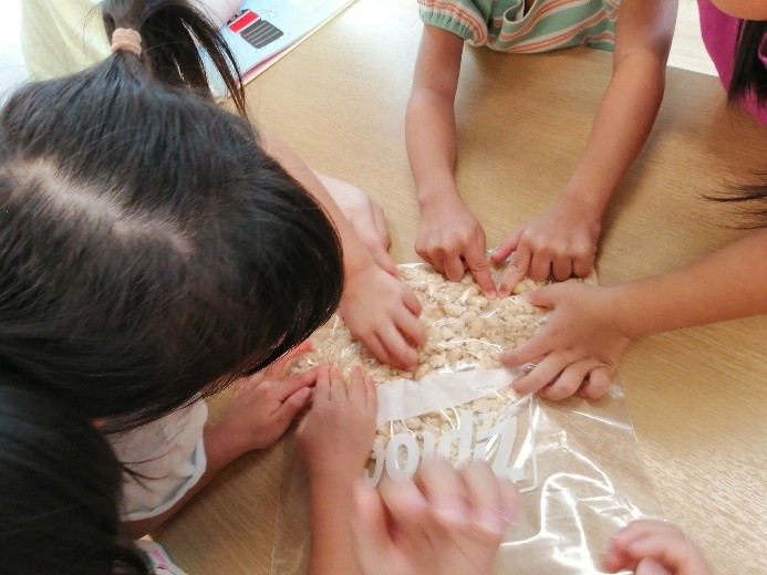そのあとひまわり組・たいよう組さんに指で大豆を潰してもらいました。