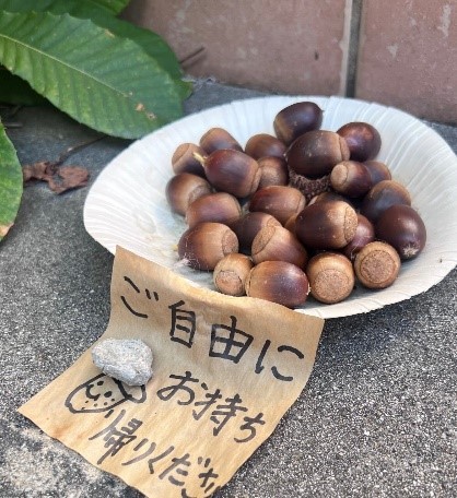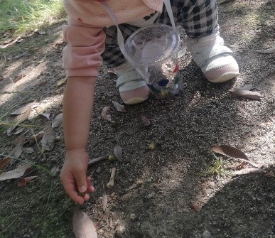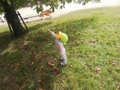 園の周りには蓬川河川敷があり、どんぐり拾いを毎年楽しんでいる場所があります。今年度も拾いに出かけてみると・・「あれ??ない・・」どうやら暑すぎたせいでいつもよりもどんぐりができる時期がずれているようです。少し残念そうに帰っていた帰り道、一軒のお家にどんぐりの木があり大きなどんぐりが!!欲しい気持ちがみんなあふれたのですが、「人のお家のものだから見るだけにしようね」と話をして帰りました。