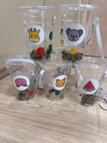 河川敷のどんぐりも少しずつ落ちてきて、それぞれのどんぐりバッグに大事そうに集めています。バッグにはしかけがあり、どんぐりぽっとん落としになっています。