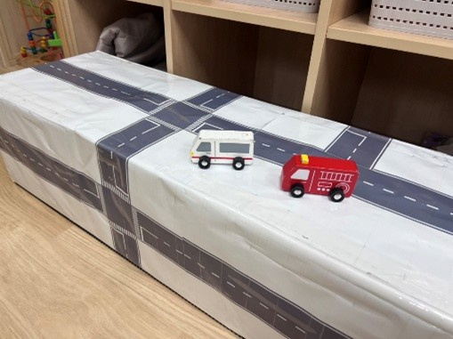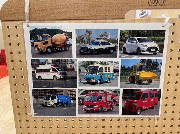 車のおもちゃをいろいろなところで走らせていたので道を準備すると、繰り返し動かしたり、働く車の写真を掲示していると指差しをして保育士に尋ねたりしていました。