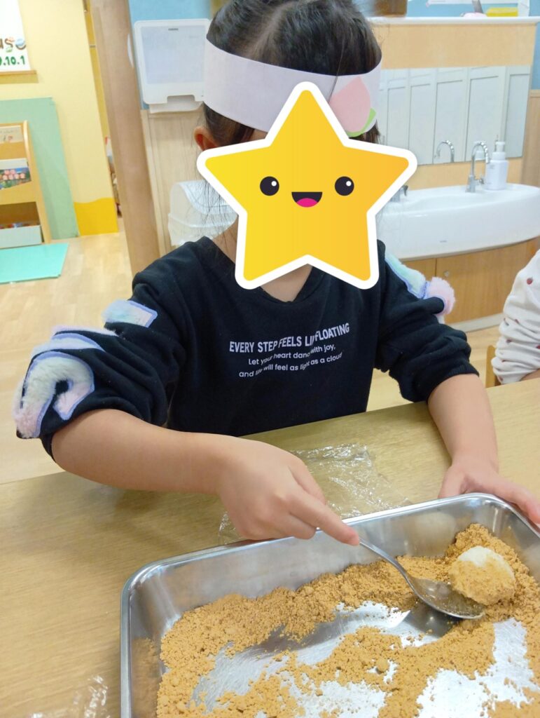 その後、丸めてきな粉をつけてきびだんごが出来上がり!!