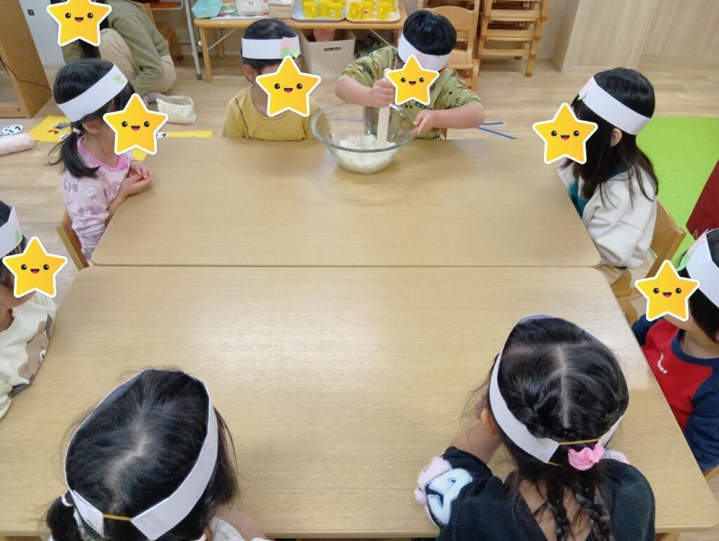 「ももたろう」といえば「きびだんご!!」きびだんごを食べると力が湧いてきます。みんなできびだんごを作ってみようということで、給食先生と一緒に作りました。