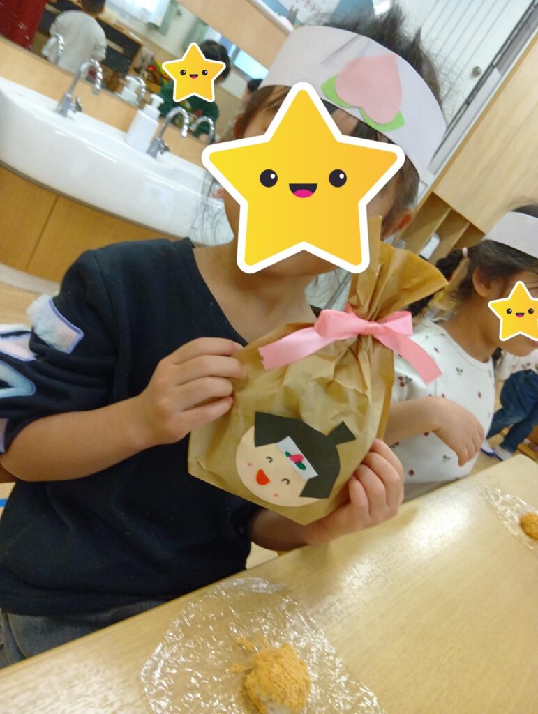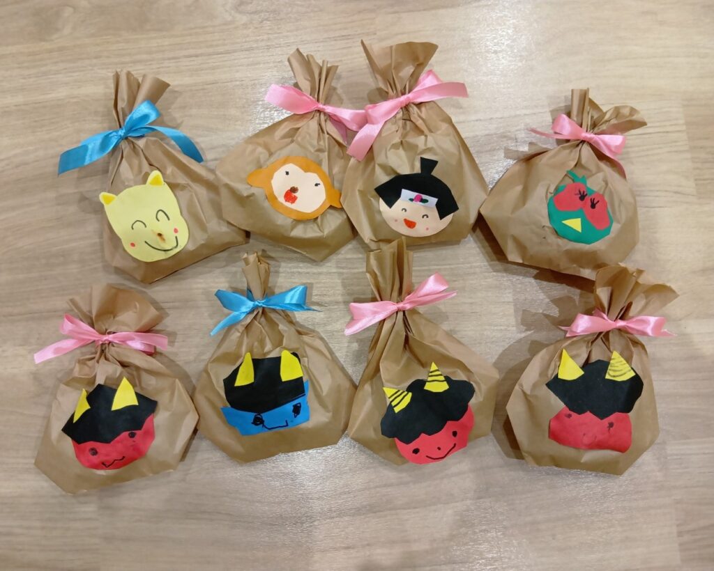 新聞紙を丸めて折り紙で包みきひだんごを作りました。その時、初めてセロハンテープを使いましたよ、テープカッターの使い方を教えてもらい、よく注意しながら使いおいそうなきびだんごを作っていましたよ。袋には、自分の役のワッペンを作り完成!!