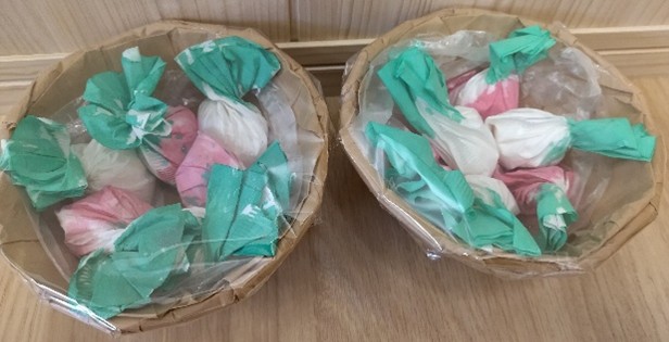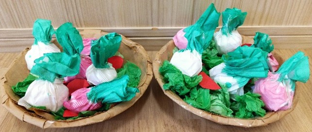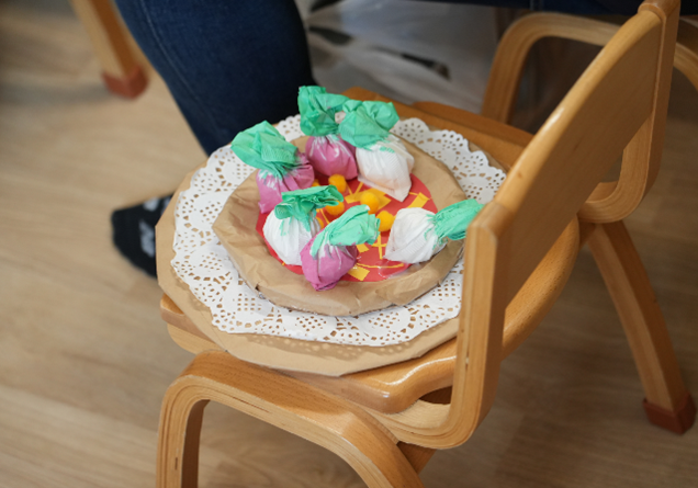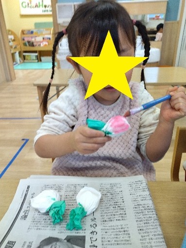 まずはそれぞれカブを作りました。ティッシュを丸めて、コーヒーフィルターで包み込み、カブの形を作ります。絵の具で色を塗っていきます。カブの葉っぱの色、赤かぶは赤色も塗りました。「じわじわしてるー」と色がにじんでいく様子を眺めていましたよ。