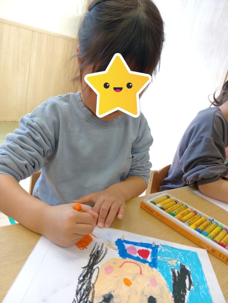 テーマを決めると紙にクレパスであっという間に表現して「自分の国旗」が出来上がっていました。