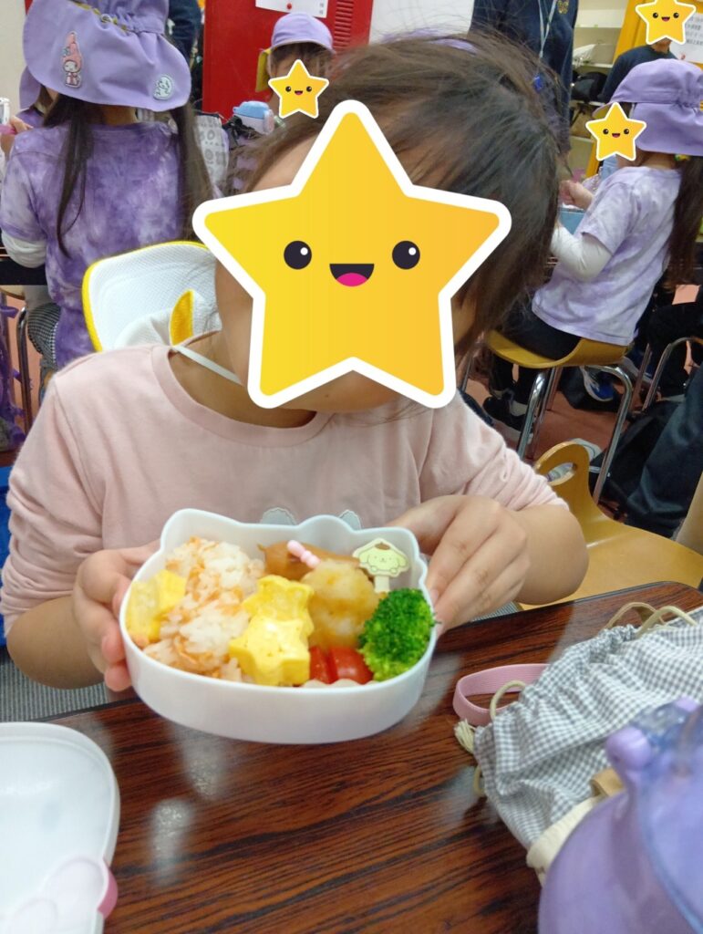 「みてみて」とみんなお家の人が作ってくれたお弁当を嬉しそうに見せてくれましたよ。あっという間に食べていました。